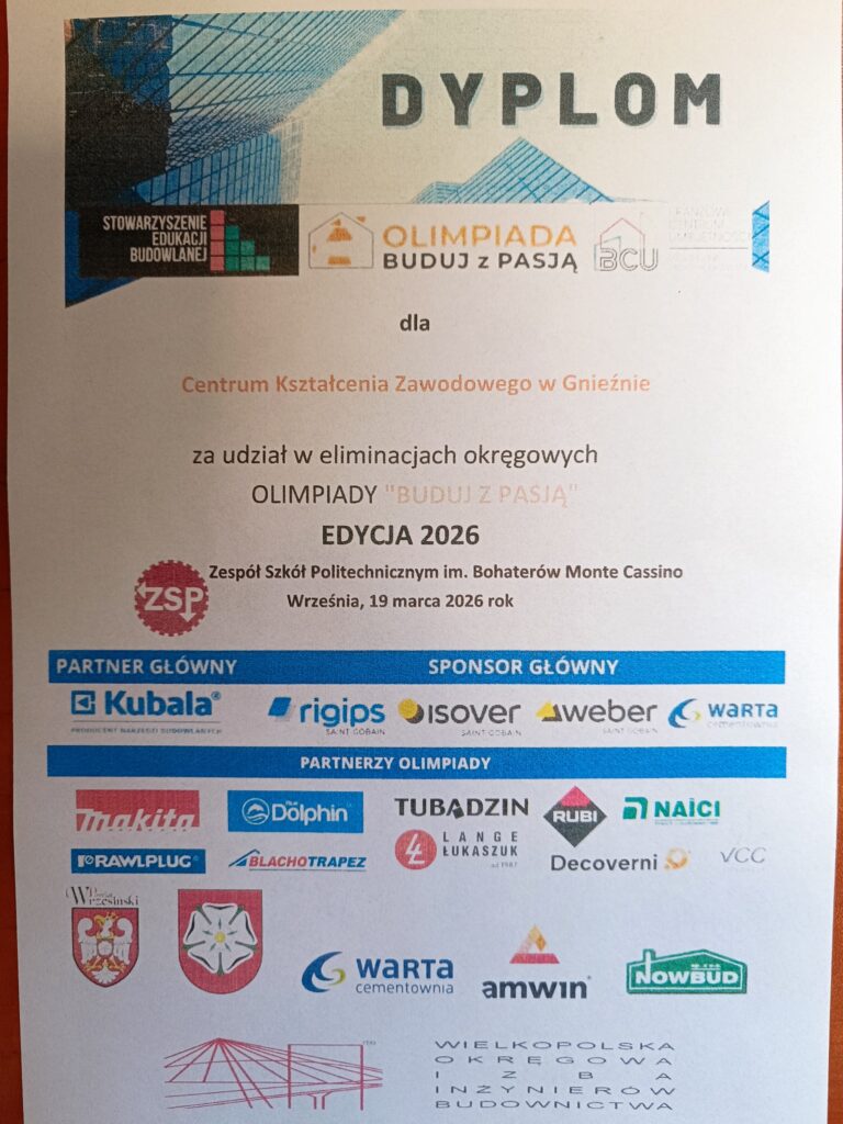 W dniu 19 marca 2026r. w Zespole Szkół Politechnicznych im. Bohaterów Mante Casino we Wrześni odbył etap okręgowy XV edycji Olimpiady „BUDUJ Z PASJĄ”.  W Olimpiadzie wzięli udział uczniowie kształcący się w Centrum Kształcenia Zawodowego w Gnieźnie na turnusie dokształcania teoretycznego młodocianych pracowników w zawodzie murarz-tynkarz Kacper Krawczyk i Hubert Roszak wraz z opiekunem p. Maciejem Somerfeld. W etapie okręgowym wzięło udział 14 zespołów. Uczestnicy musieli zmierzyć się z zadaniem praktycznym oraz wykazać się wiadomościami teoretycznymi z zakresu budownictwa.  Z niecierpliwością czekamy na wyniki a naszym uczestnikom  życzymy jak najlepszego wyniku.
